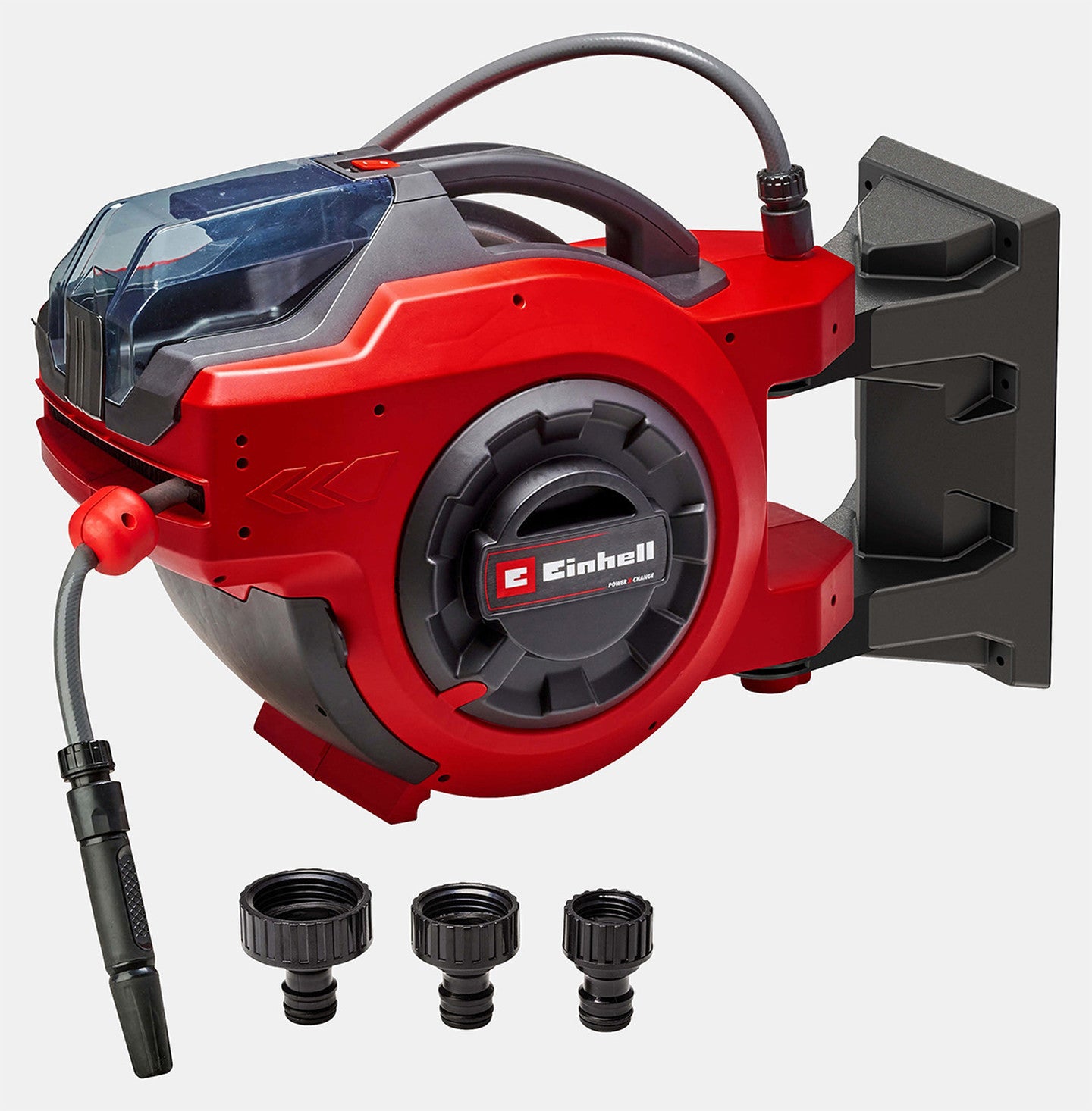 • Tek bir düğmeye basıldığında, ürünle birlikte verilen 30 m uzunluğunda, 12.5 mm çapında UV ışınlarına dayanıklı bahçe hortumu otomatik olarak hortum makarasına sarılır.
