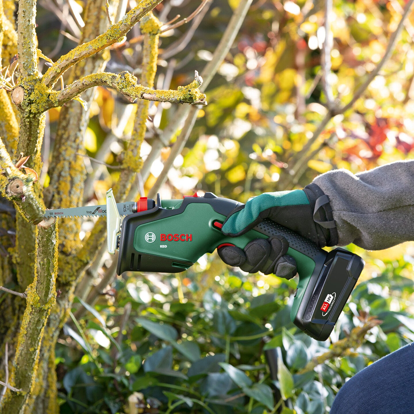 Güvenle çalışın! Bosch Keo 10,8V Akülü Bahçe Testeresi, özellikle merdiven üzerinde yüksek dallara ulaşmaya çalıştığınız durumlarda size büyük kolaylık sağlayacak.