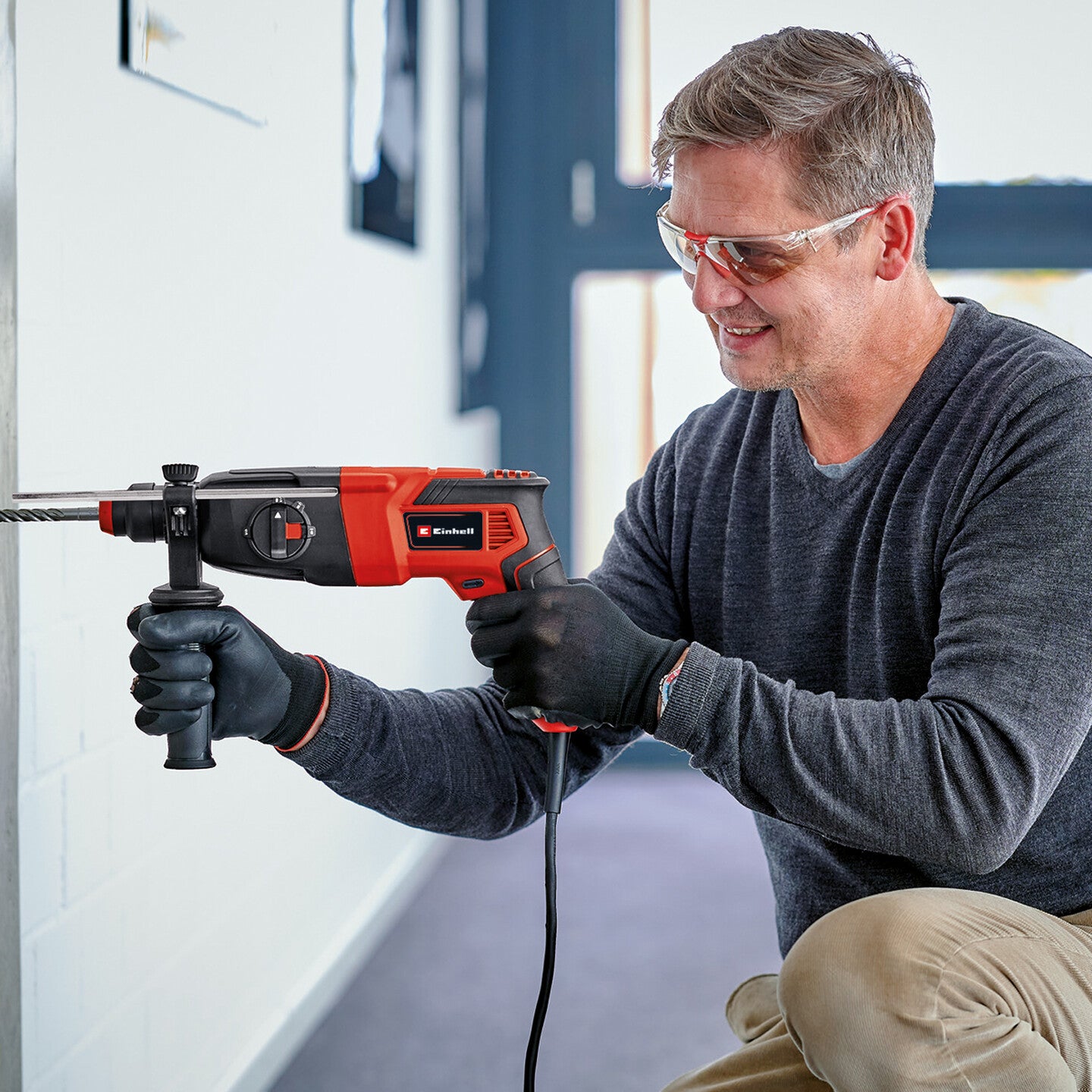 Einhell TE-RH 28/1 5F Kırıcı Delici, atölyede vazgeçilmez yardımcınız olacak çok amaçlı ve 5 fonksiyona sahip bir üründür. Delme, darbeli delme, keskileme, sabit keskileme ve vidalama yapabilirsiniz. Einhell`in güçlü kırıcı delicisi işleriniz için en ideal donanıma sahiptir. 2 vitesli şanzımanı, 1. viteste vidalama, 2. vitesle delme yapmanızı sağlar. 950 W gücü sayesinde beton-taş, ahşap ve metal gibi standart materyalleri delmenizi sağlar. Beton delme kapasitesi 28 mm`dir. Pnömatik darbe mekanizması çok iyi bir ileri itişi gücü sağlar. 5 fonksiyondan istediğinizi seçebilmeniz için seçme anahtarı bulunur. Kesintisiz çalışma kilidi ile rahat ve kullanıcı dostu bir kullanım sunarken geniş yumuşak kaplamalı tutamak yüzeyi sağlam bir tutuş sağlar. Otomatik kaydırma fonksiyonuna sahip güçlü SDS-Plus mandren ile takım değiştirme hızlı ve kolaydır. İlave mandren vidalama ve delme işlemi içindir. Ekstra dayanıklılığa sahip metalden yapılmış olan derinlik mesnedi ve E-Box 40 taşıma ve saklama çantasıyla birlikte gelir.