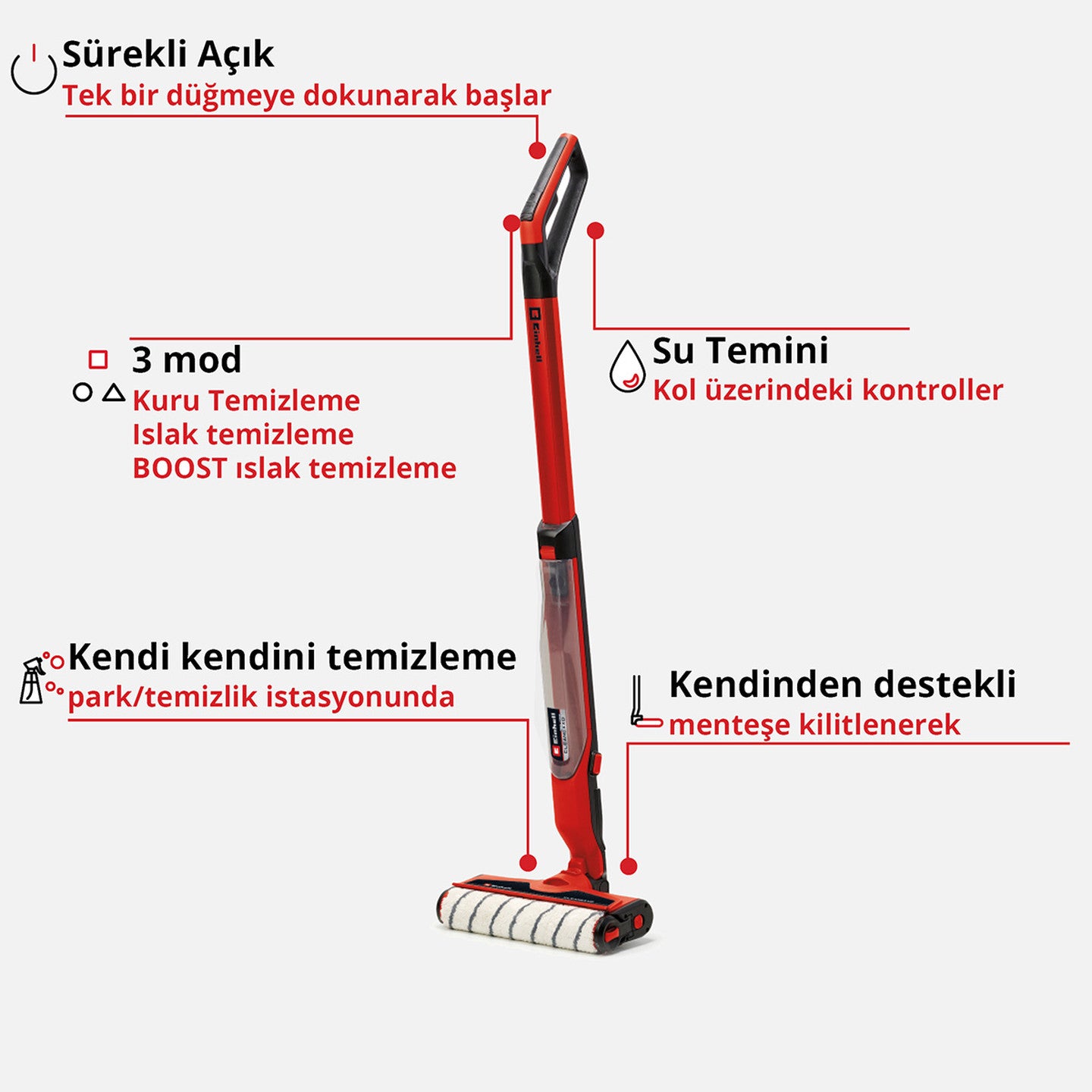 Paspasın yerine geçen Einhell kablosuz sert zemin temizleyici CLEANEXXO, evdeki temizlik işlerinde yoğun bir yardımcıdır ve bu nedenle elektrikli süpürgenin mükemmel tamamlayıcısıdır. Power X-Change ailesinin bir üyesi olan sert zemin temizleyici, sistem ailesindeki tüm akü ve şarj cihazlarıyla kombine edilebilir. Süpürge, değiştirilebilir akü sistemi sayesinde sınırsız, kablosuz çalışma süresi sunar: Akülerden biri boşsa, diğerini takıp silmeye devam edebilirsiniz. Sert zemin temizleyicinin su beslemesi veya su miktarı, bir tetik kullanılarak doğrudan kol üzerinden kontrol edilir. Silindirin dönüş hızını etkileyen standart ve BOOST modlarıyla birlikte temizleyici, hem normal kir ve tozu hem de inatçı lekeleri giderir. BOOST modunda tetiğe basıldığında su miktarı da artar. Su verilmediği takdirde silindir sadece zemindeki nemi emerek zemini kurutabilir. 400 ml`lik temiz su deposundan gelen su, zemin temizliği için kullanılan fırçayı nemlendirir. Su özel bir mekanizma vasıtasıyla tekrar emilerek kirli su deposunda (300 ml) toplanır. Doldurma, boşaltma ve temizleme için her iki tank da cihazdan tamamen çıkarılabilir. İnce tasarımı ve katlanabilir pil tutucusu sayesinde akülü sert zemin temizleyici köşelere, kenarlara ve dar alanlara kolaylıkla ulaşabilir. Yumuşak kavramalı ve her zaman açık işlevli ergonomik sap sayesinde temizleyicinin kullanımı rahattır. CLEANEXXO, birlikte verilen park/temizlik istasyonunda en iyi şekilde saklanır. Kendi kendine ayakta durma fonksiyonu sayesinde dik durur. Park istasyonunun alt kısmındaki kendi kendini temizleme fonksiyonu ve özel temizleme dişleri kullanılarak BOOST düğmesine 3 saniye basılarak fırça merdanesi temizlenir. Birlikte verilen temizleme aletinin yardımıyla, örneğin nozül de temizlenebilir veya silindir çıkarılabilir. B. saç serbest bırakılabilir. Entegre taşıma kolu sayesinde sert zemin temizleyicisi ve temizleme istasyonunun taşınması kolaydır. Fırça rulosu parke, laminat, PVC, mantar, linolyum gibi çeşitli zeminlerin ve hatta taş zeminler ve taş fayanslar gibi daha kaba yüzeylerin temizlenmesi için uygundur. Fırça rulosu aletsiz değiştirilebilir ve makinede yıkanabilir. Aksesuar olarak ayrı bir yedek silindir mevcuttur. CLEEANEXXO akülü sert zemin temizleyicisi akü ve şarj cihazı olmadan teslim edilir.