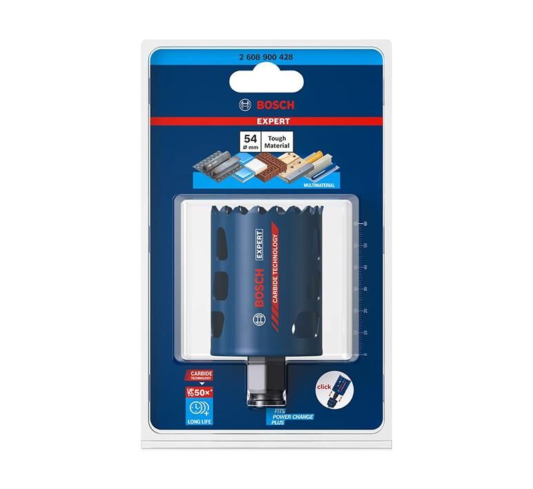 Bosch Carbide Teknolojisine sahip 54 mm panç zorlu malzemelerin çivili ahşap, metal, paslanmaz, WPC plastik vb. delik işlerinde mükemmel performans gösterir.