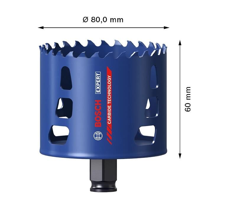 Bosch Carbide Teknolojisine sahip 80 mm panç zorlu malzemelerin çivili ahşap, metal, paslanmaz, WPC plastik vb. delik işlerinde mükemmel performans gösterir.