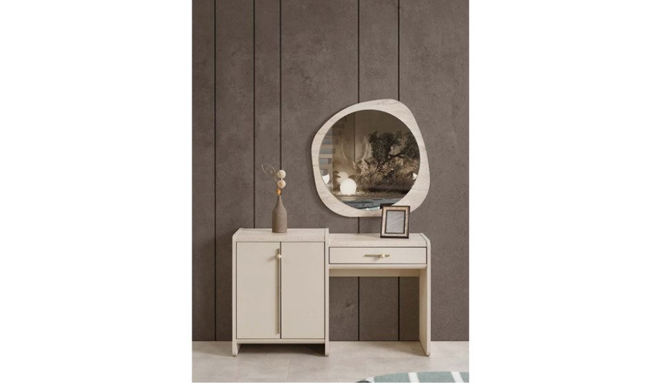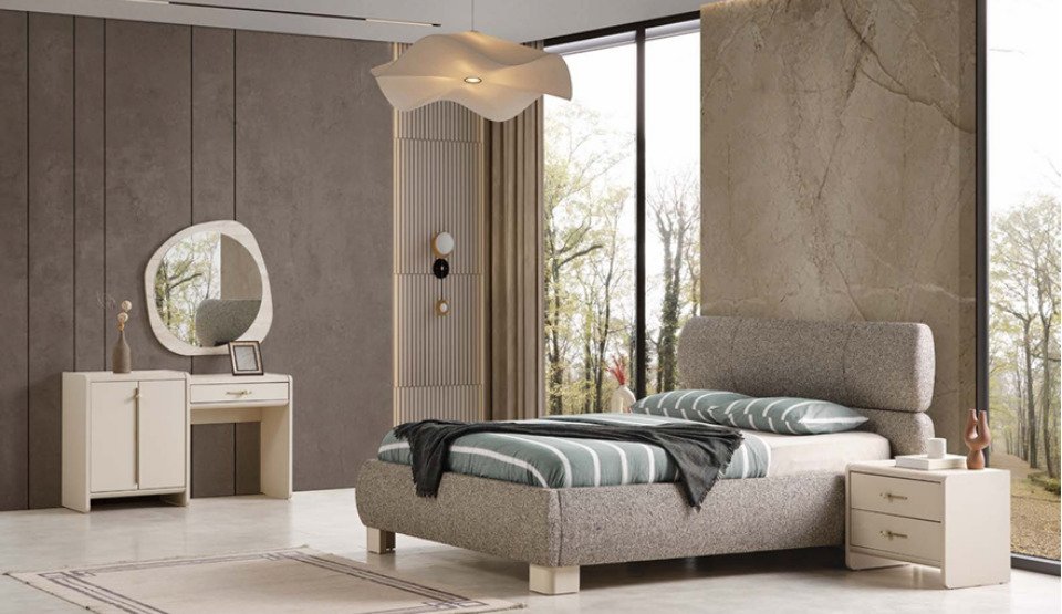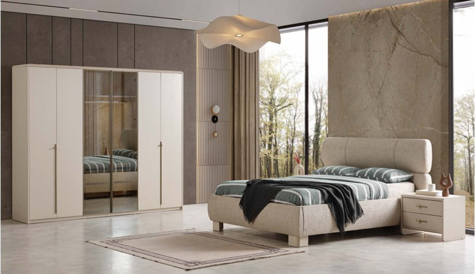 Yatak odası takımı içerisinde Başlıklı Bazalı Karyola, 2 Komodin, Dolap, Şifonyer ve Aynası vardır.