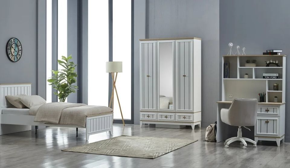 Takım İçeriği 3 Kapaklı Dolap, 100*200 Başlıklı Karyola, Komodin bulunmaktadır.