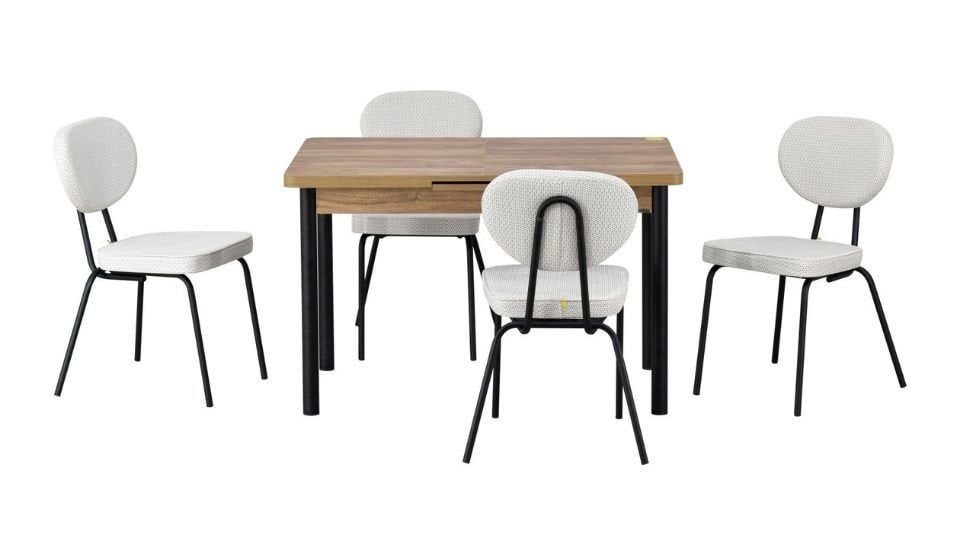 Evinizi yeniden keşfedin; şıklık ve fonksiyonelliği bir araya getiren bu mobilya setiyle yaşam alanlarınıza zarafet katın. hem küçük aile yemekleri için ideal bir kullanım sunar hem de misafir ağırlarken ekstra alan ihtiyacınızı karşılar. Masanın etrafında konumlanan sandalyeler, ergonomik tasarımlarıyla uzun süreli oturumlarda bile konfor sağlar, modern çizgileriyle de göz zevkinize hitap eder.