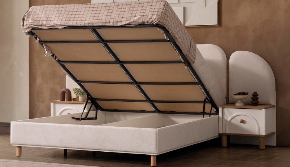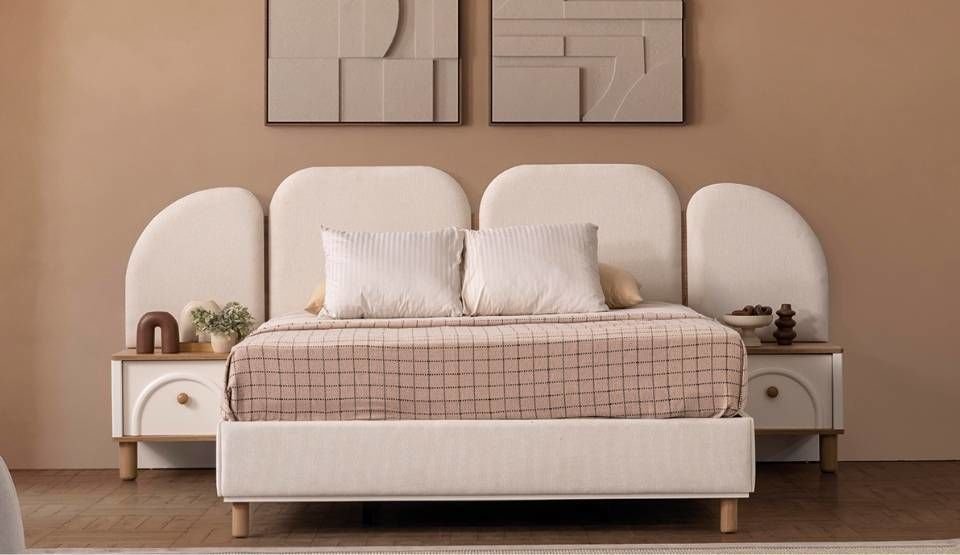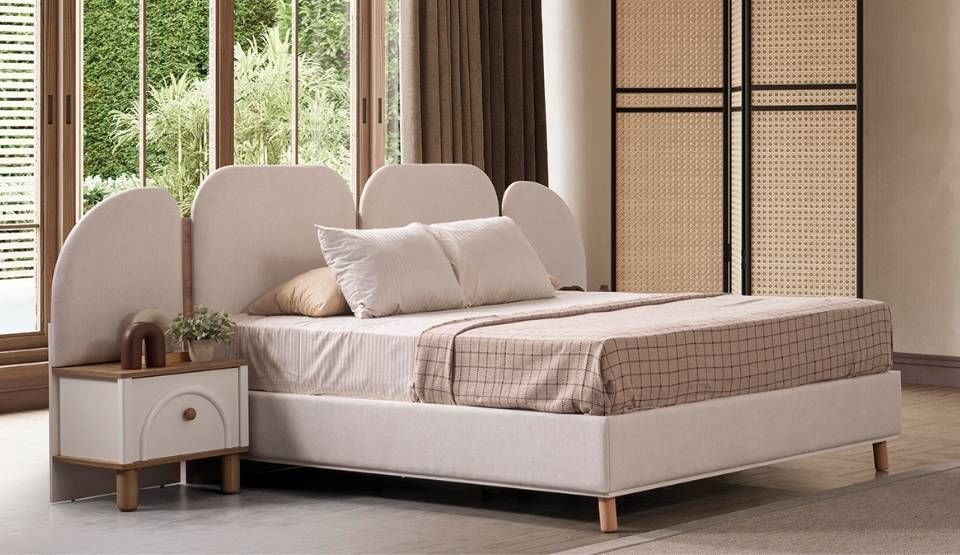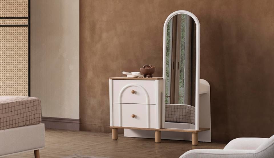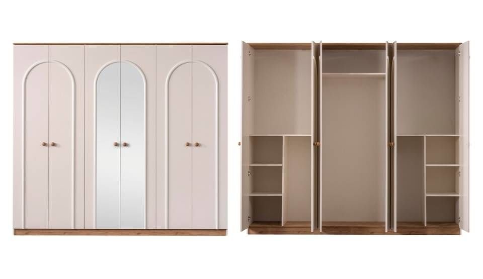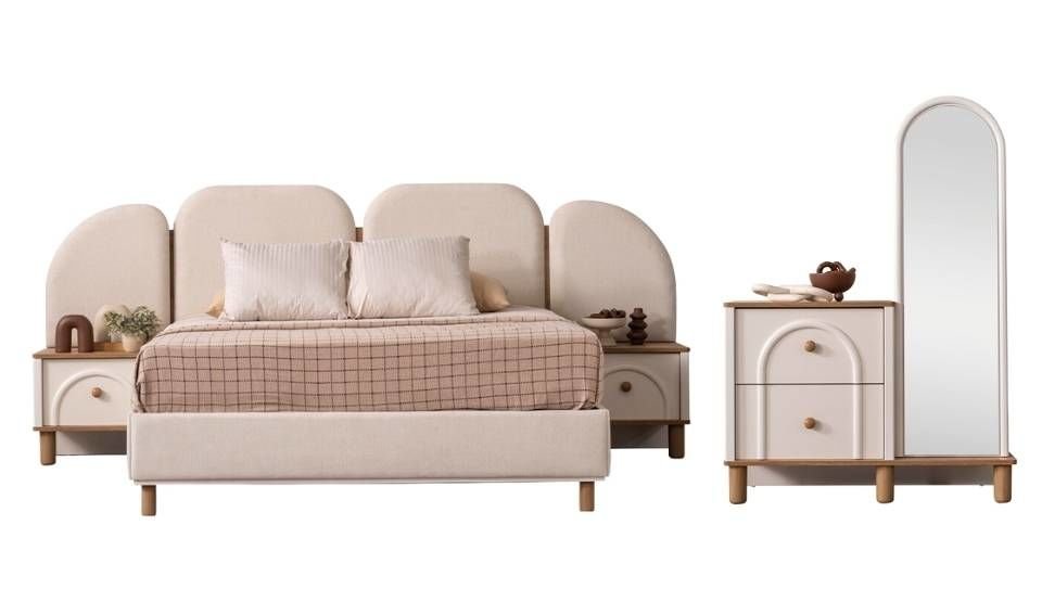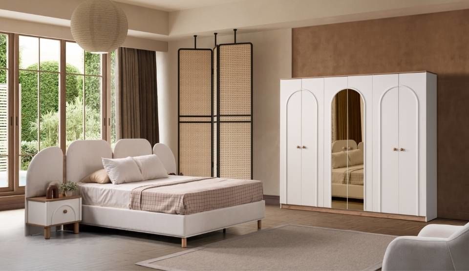 Ürün İçerisinde Dolap, şifonyer + ayna, 2 adet komodin, baza ve başlık vardır.