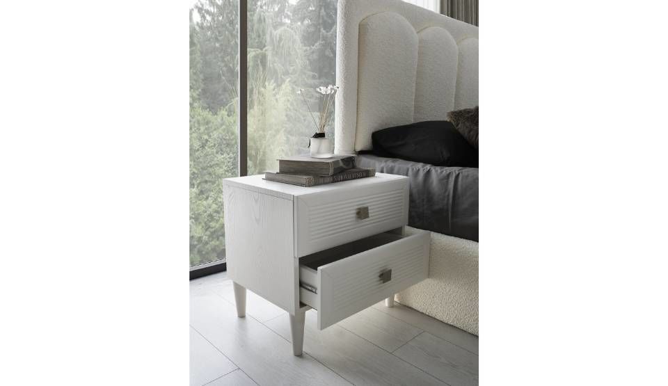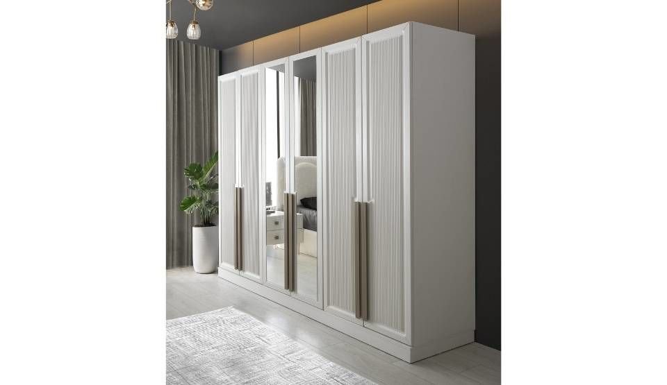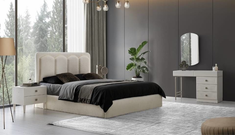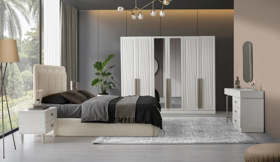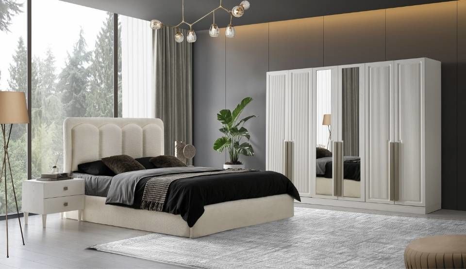 Yatak odası takımı içerisinde Dolap, Aynalı Şifonyer, 2 Adet Komodin ve Başlıklı Bazalı Karyola bulunmaktadır.