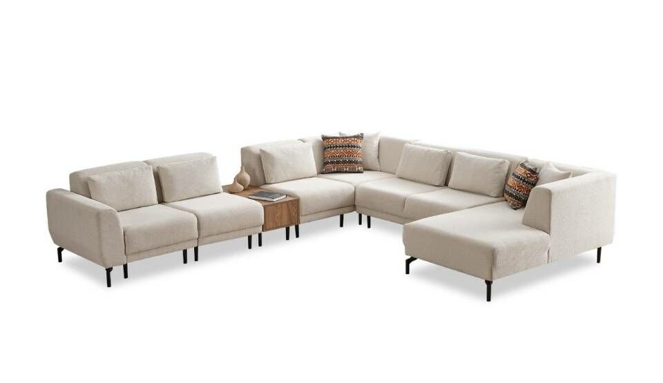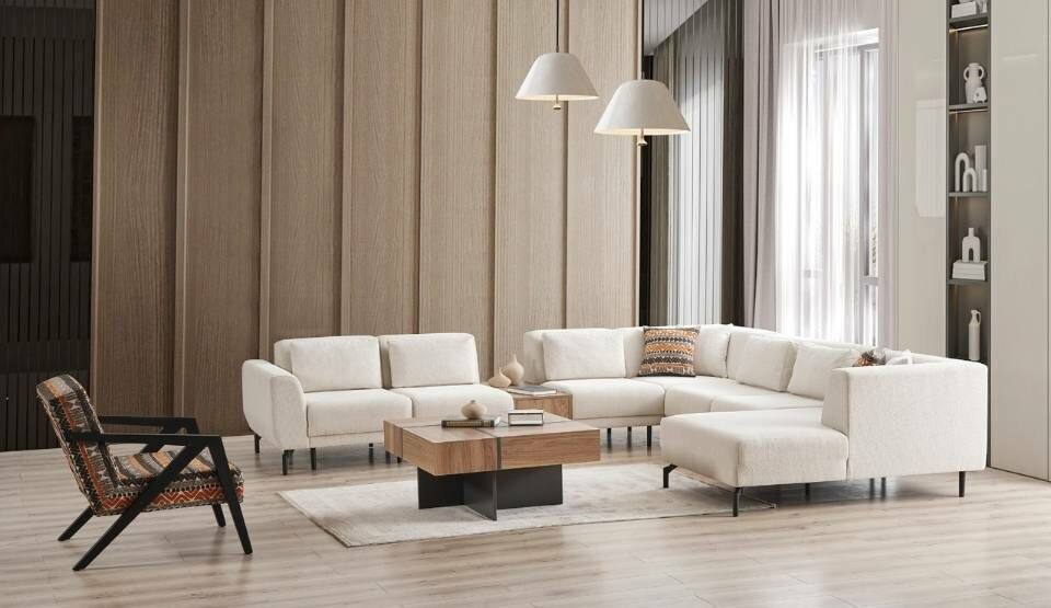 Ürün içeriğinde Köşe takımı içerisinde 1 adet tek kollu ikili modül, 1 adet ahşap sehpa modül, 1 adet kolsuz tekli modül, 1 adet sabit köşe modül, 1 adet kolsuz ikili modül ve 1 adet dinlenme modül vardır.