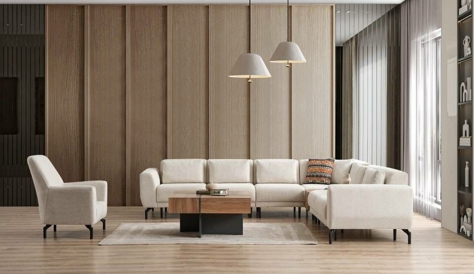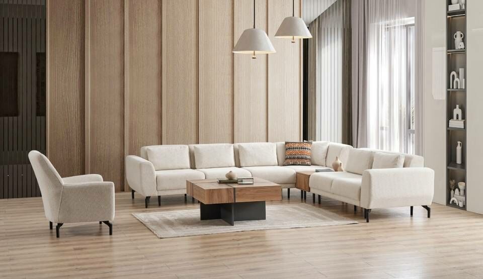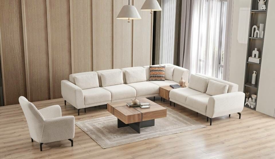 Ürün içeriğinde Köşe takımı içerisinde 1 adet tek kollu ikili modül, 1 adet kolsuz tekli modül, 1 adet sabit köşe modül, 1 adet ahşap sehpa modül ve 1 adet tek kollu ikili modül vardır.