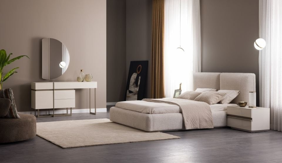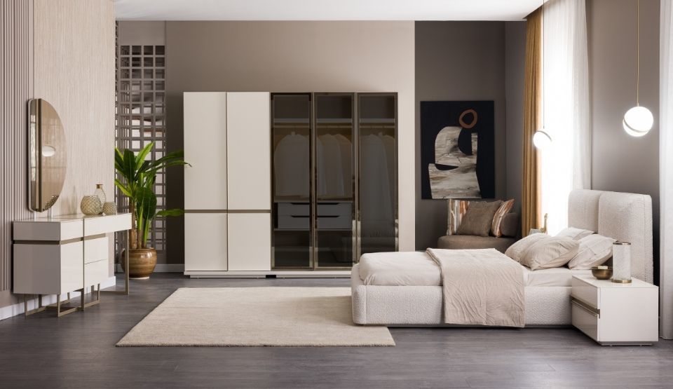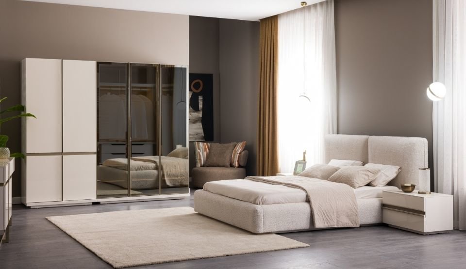 Takım içeriği dolap, şifonyer , başlıklı karyola, 2 adet komodin ve Baza vardır.