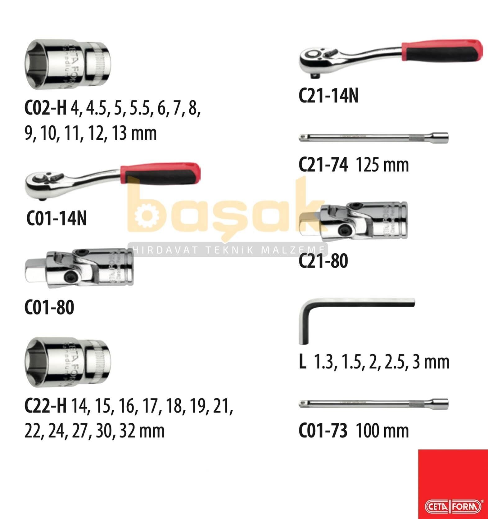 Ceta Form 35 parçalı lokma takımı hem 1/4” girişli hem de 1/2” girişli lokma anahtarları ve cırcır kollarından oluşmaktadır. 4 mm’den 13mm’e kadar cıvata ve somunlarınız için 1/4” adaptörlü, 14 mm’den 32 mm’ye kadar cıvata ve somunlarınız içinde 1/2” adaptörlü çözümü ile hem küçük çaplı hem de büyük çaplı işleriniz için uygundur.