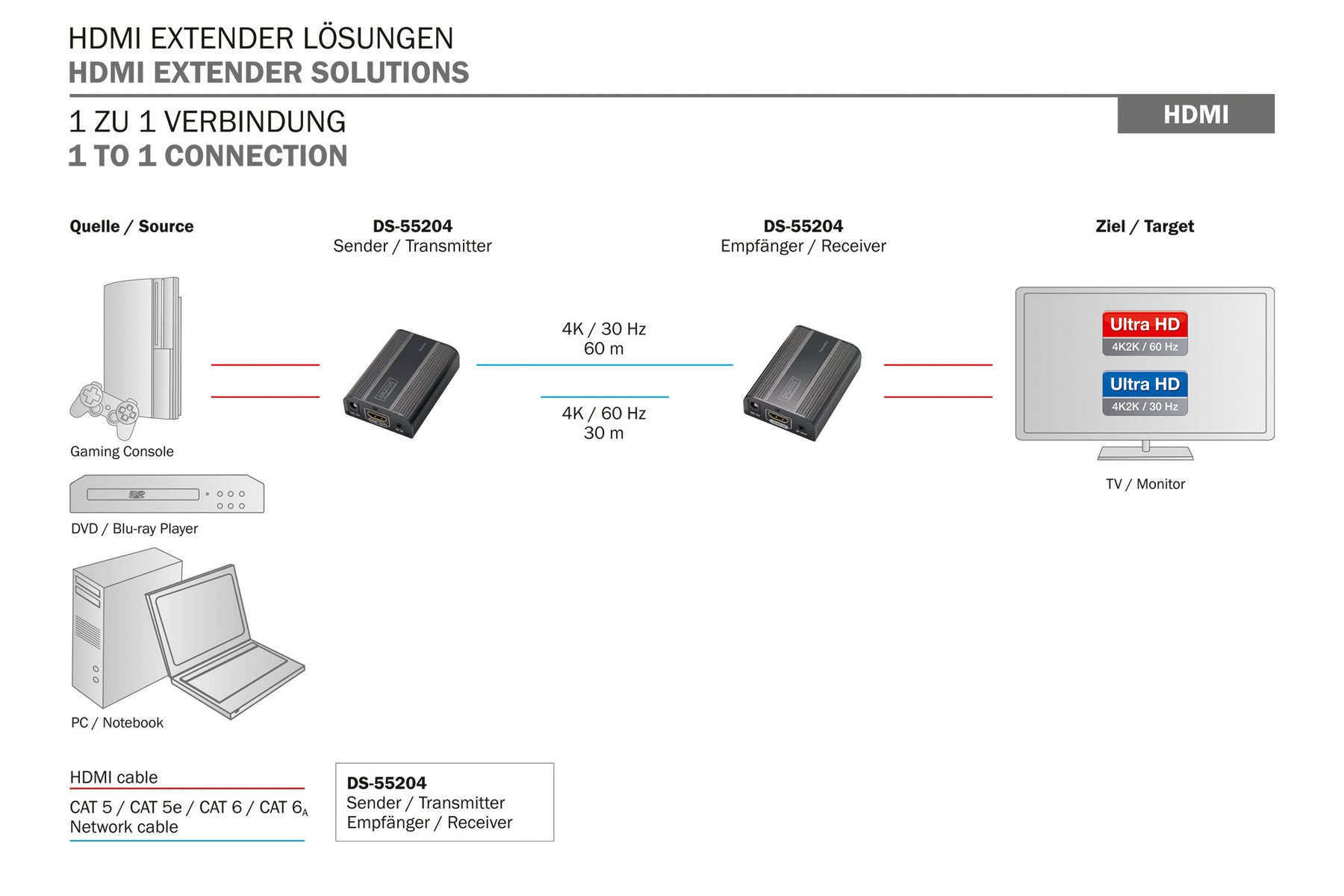 Digitus HDMI Sinyal Uzatma Cihazı, 1 X Alıcı (Receiver), 1 X Verici (Transmitter) Birim Dahil, Maksimum 60 Metre, UHD 4K2K/60 Hz, HDMI 2.0, HDCP 2.2 (DS-55204)