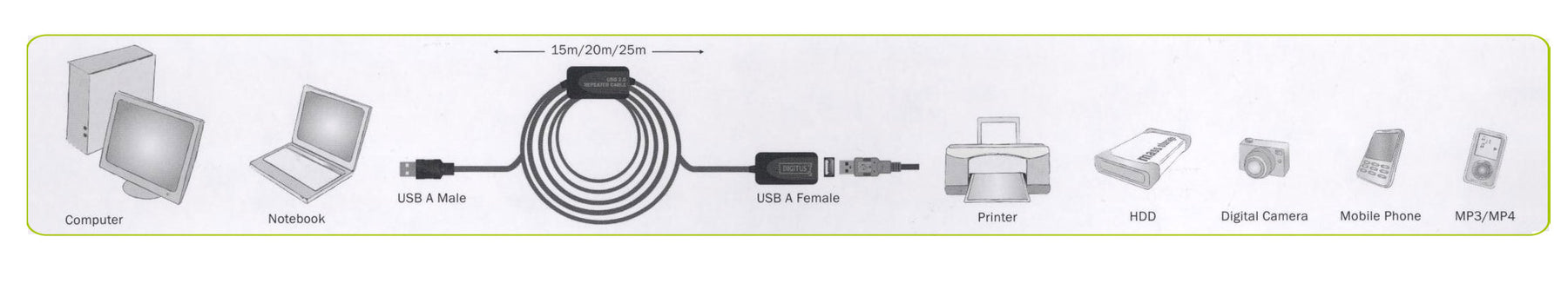 Digitus USB 2.0 Repeater / Uzatma Kablosu, USB A erkek / A dişi, 15 metre Digitus USB 2.0 Repeater Cable, 15 m