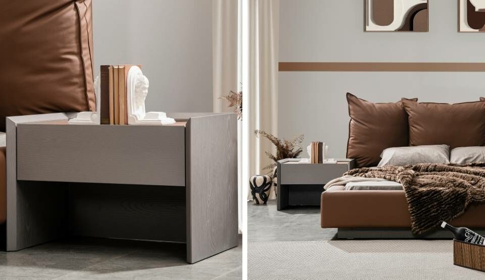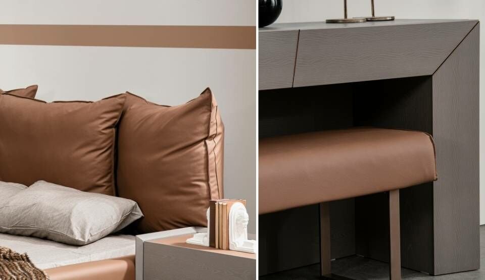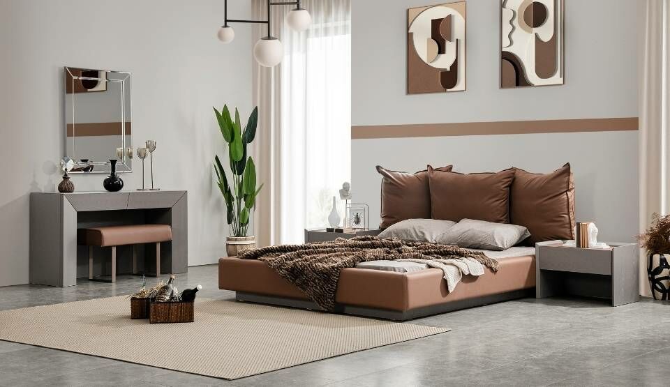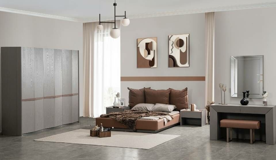 Takım İçeriği dolap, şifonyer ve aynası, 2 komodin ve karyola vardır.