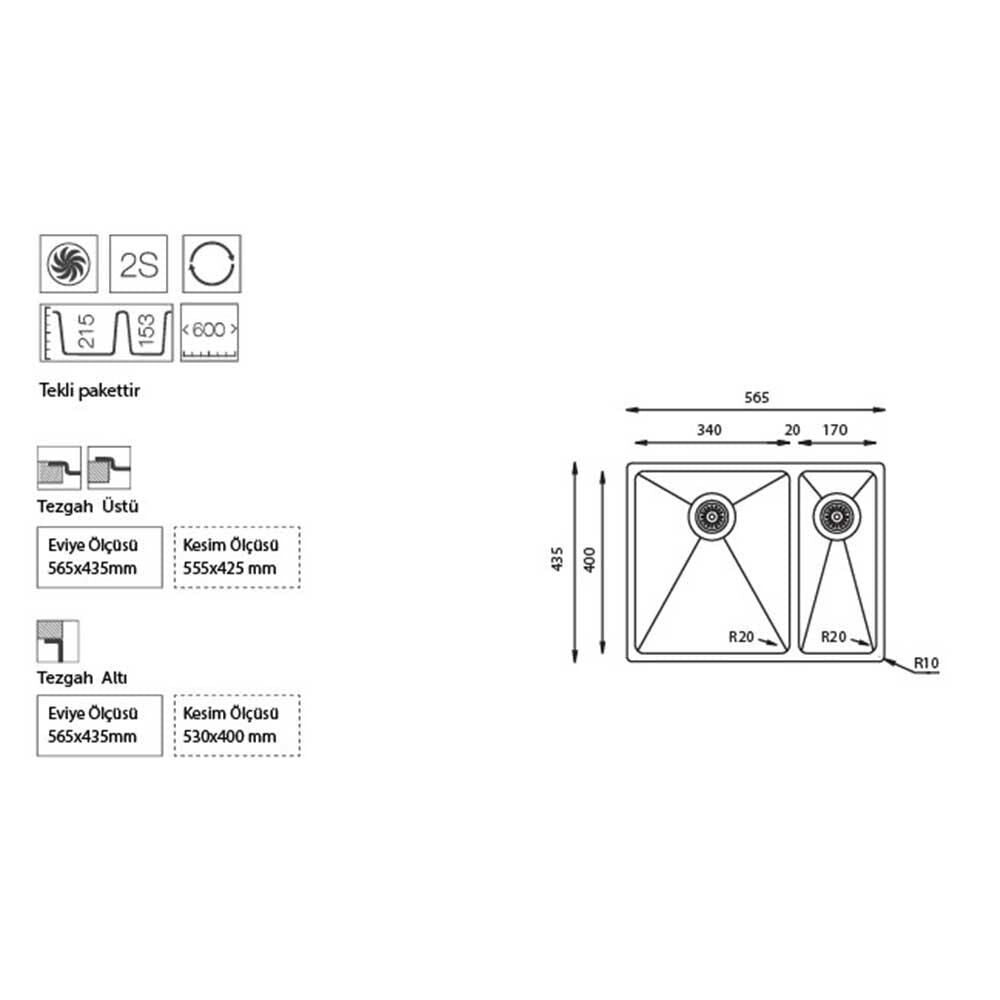 Ukinox ME 340.70 Küçük Göz Sol Tezgah Altı Evye